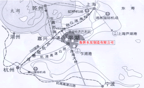 平湖市振新水泵制造有限公司位于浙江省东部,离上海市区100公里,闵行(上海水泵厂)70公里,苏州110公里,杭州100公里。2008年杭州湾跨海大桥建成后至宁波100公里。全程高速公路直达我公司。